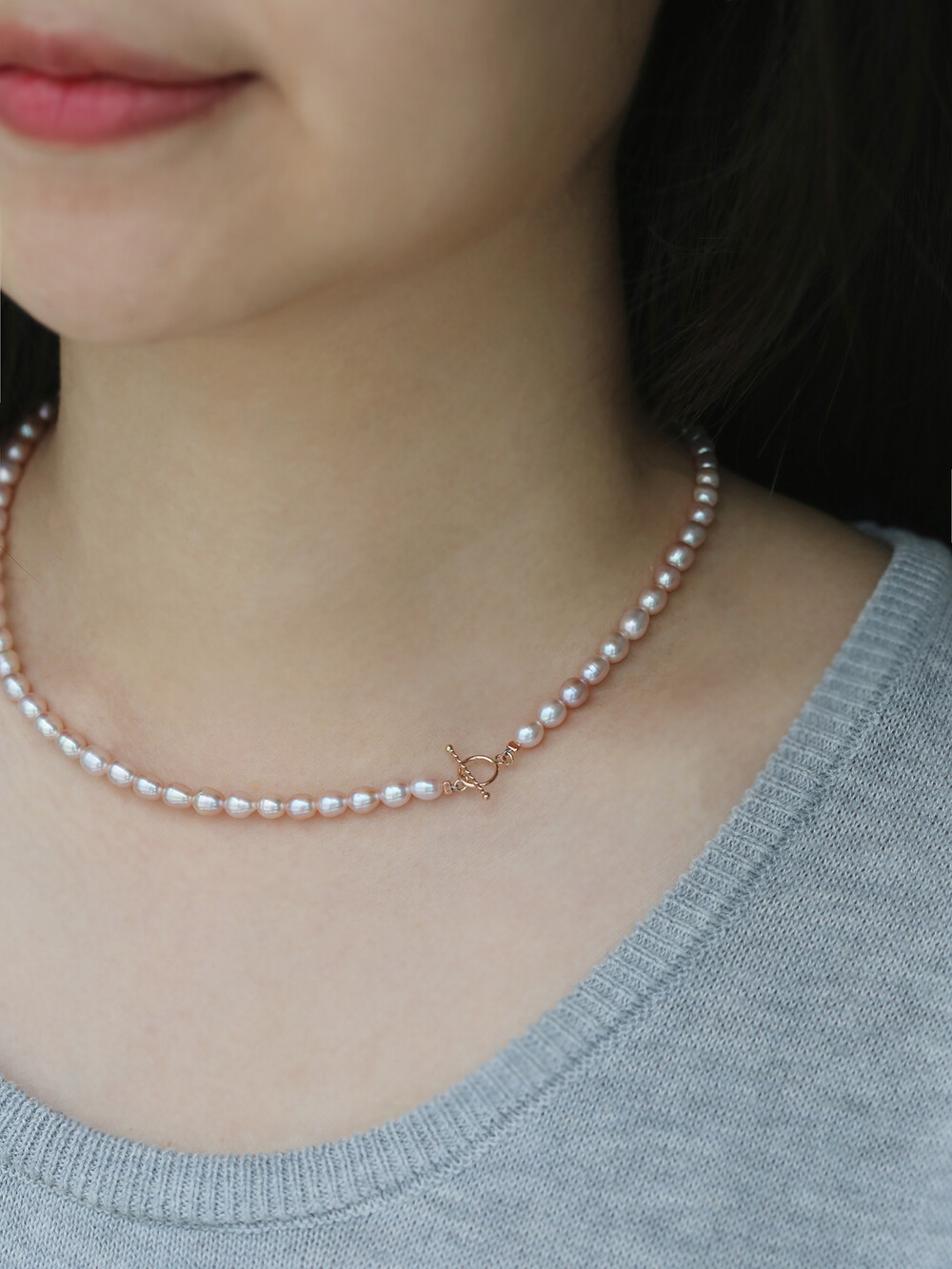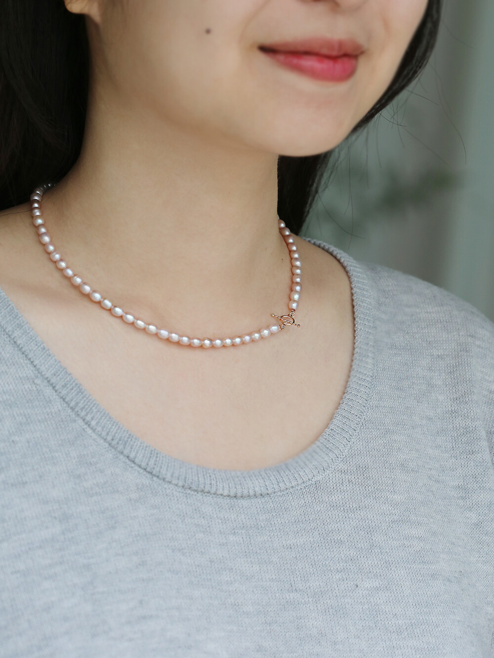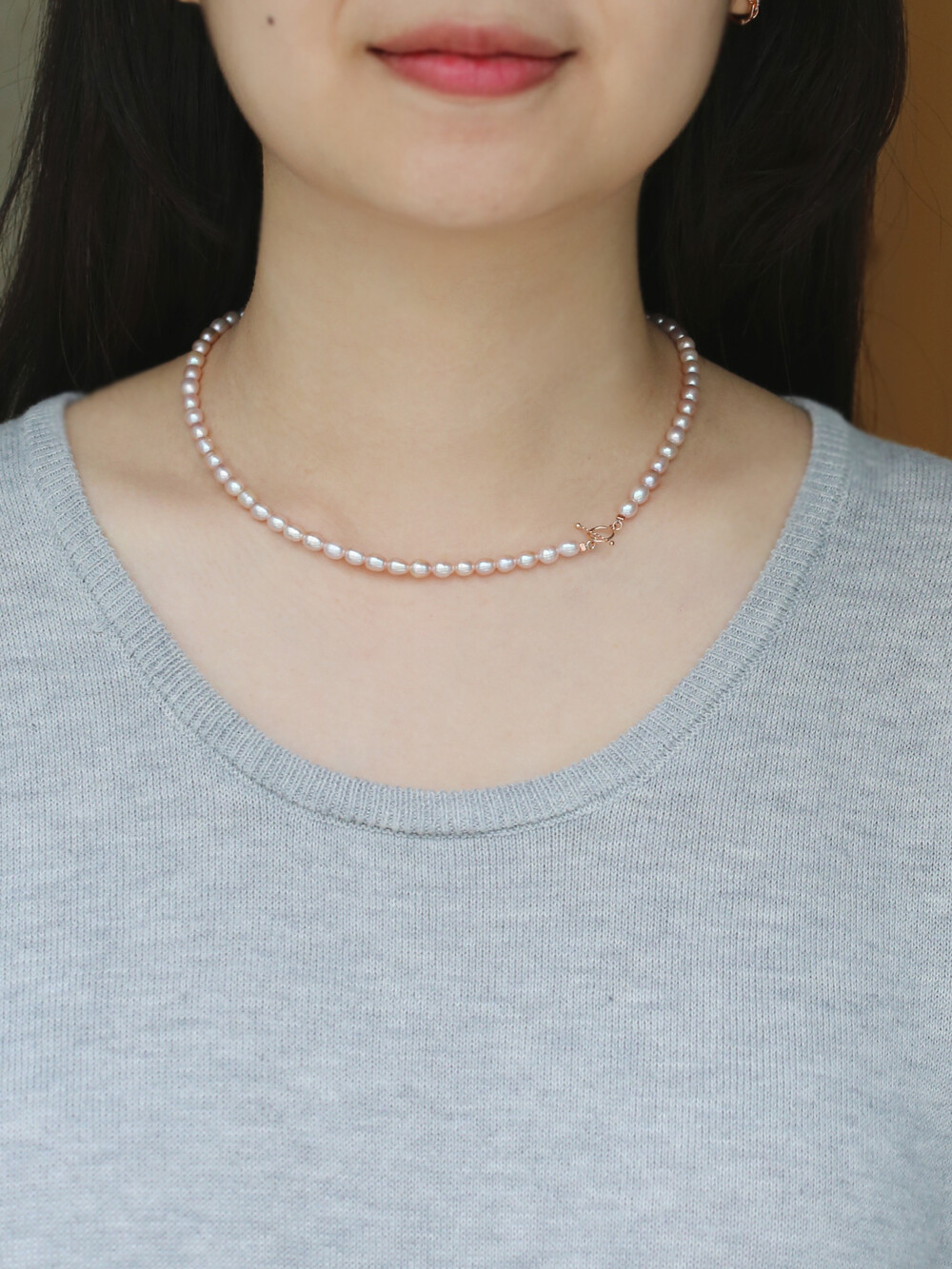 컬러가 라벤더 컬러가 더 돋보이는 진주 비드 목걸이입니다