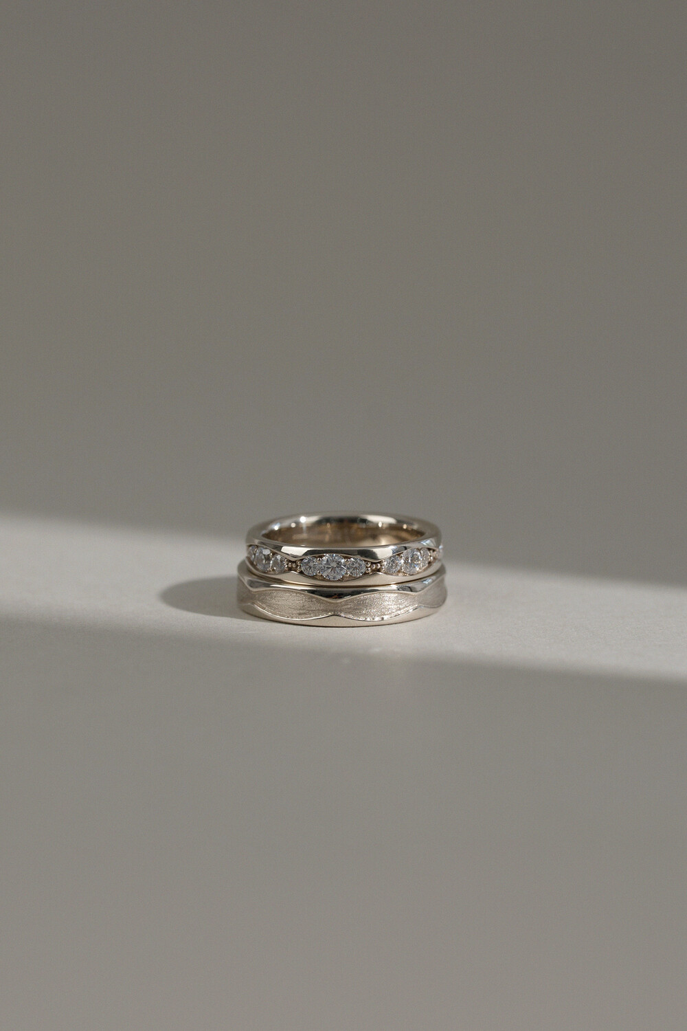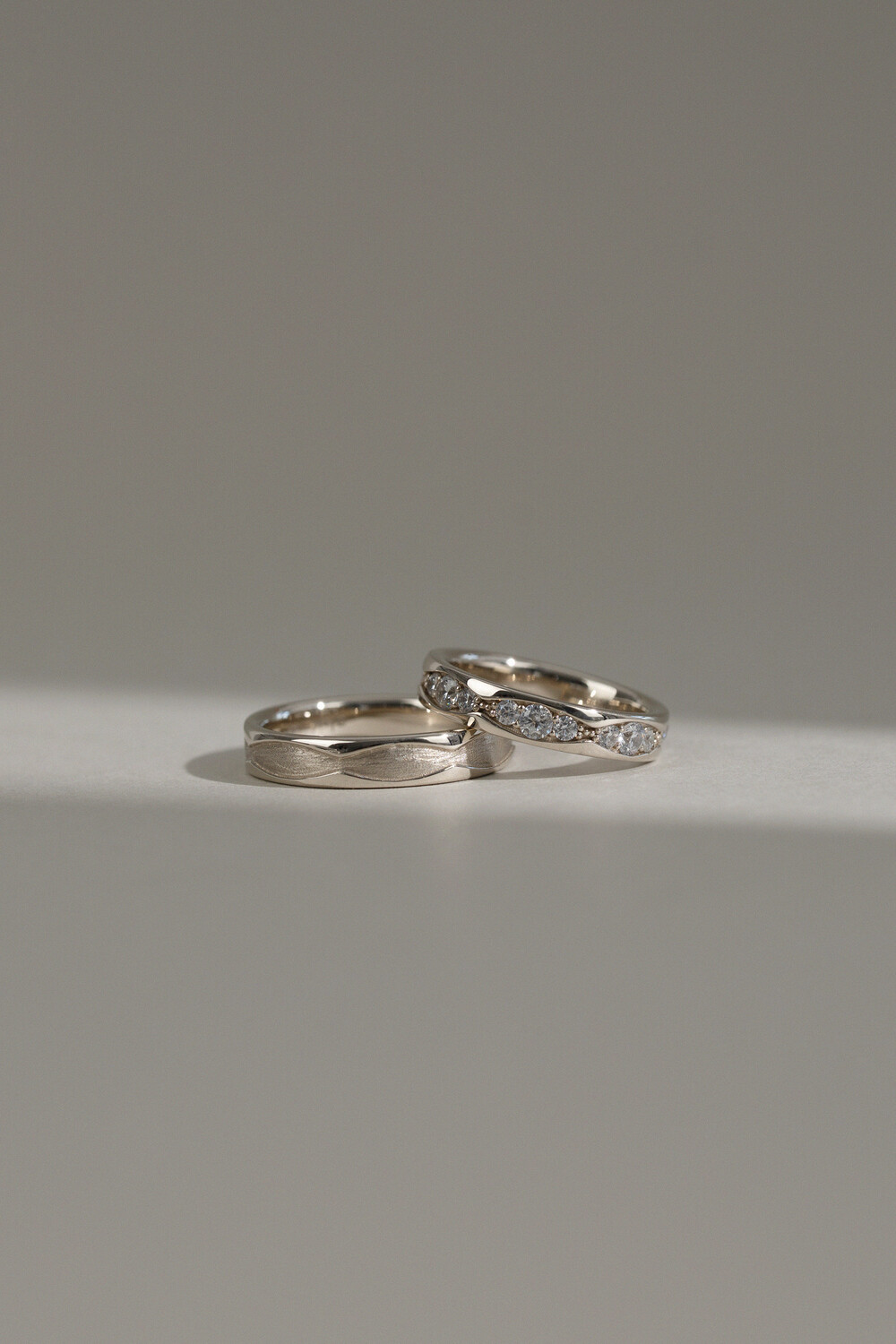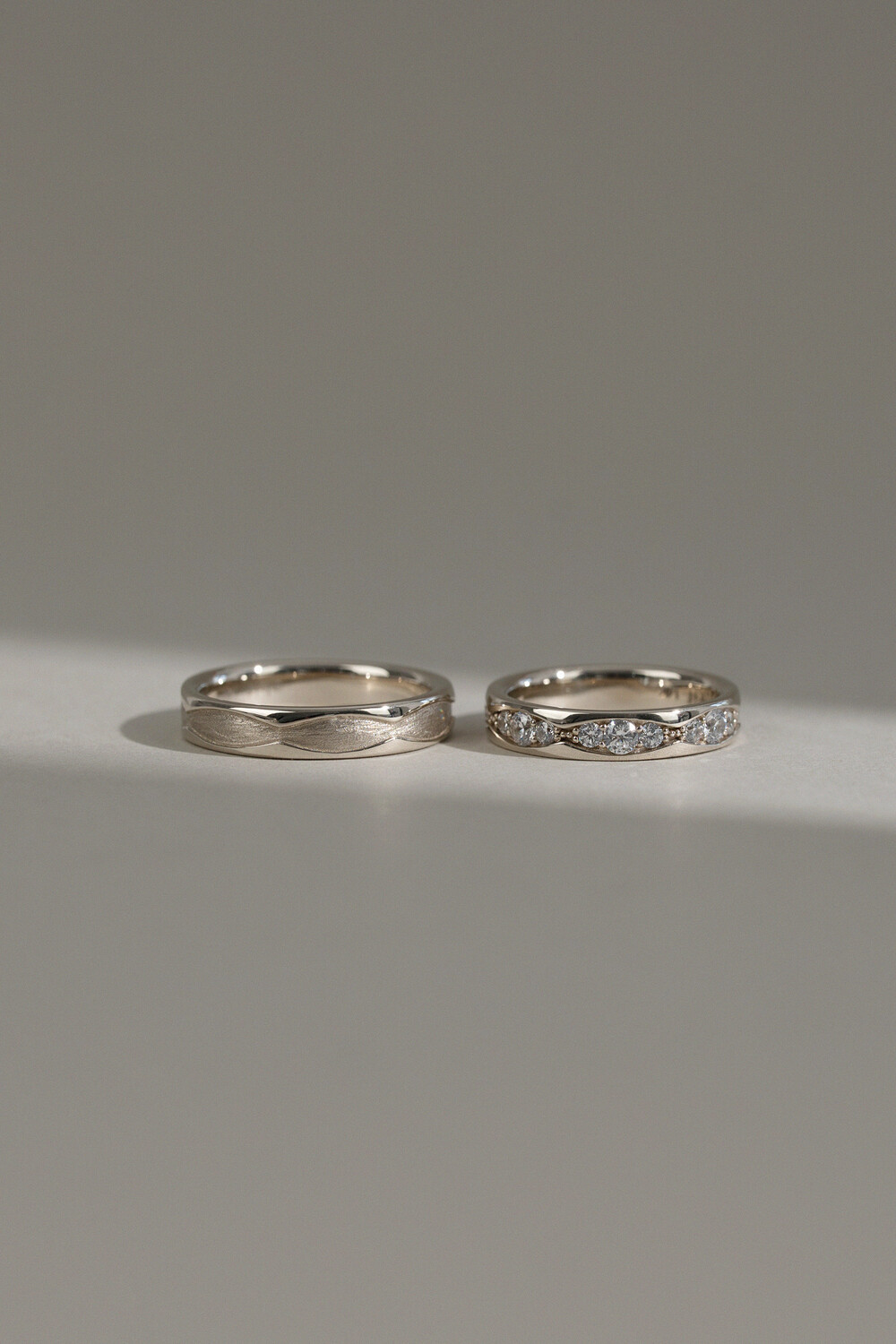 영원한 사랑을 의미하는 이터니티 웨딩밴드. 다이아몬드버전은 다른 사이즈 의 다이아몬드를 세팅하여 조금 더 화사한 분위기를 선사하고, 무광 버전은 안쪽을 은은한 무광으로 바깥쪽은 유광으로 작업하여 심플하지만 모던한 분 위기를 내는 아키프 감성이 가득담긴 웨딩밴드 입니다