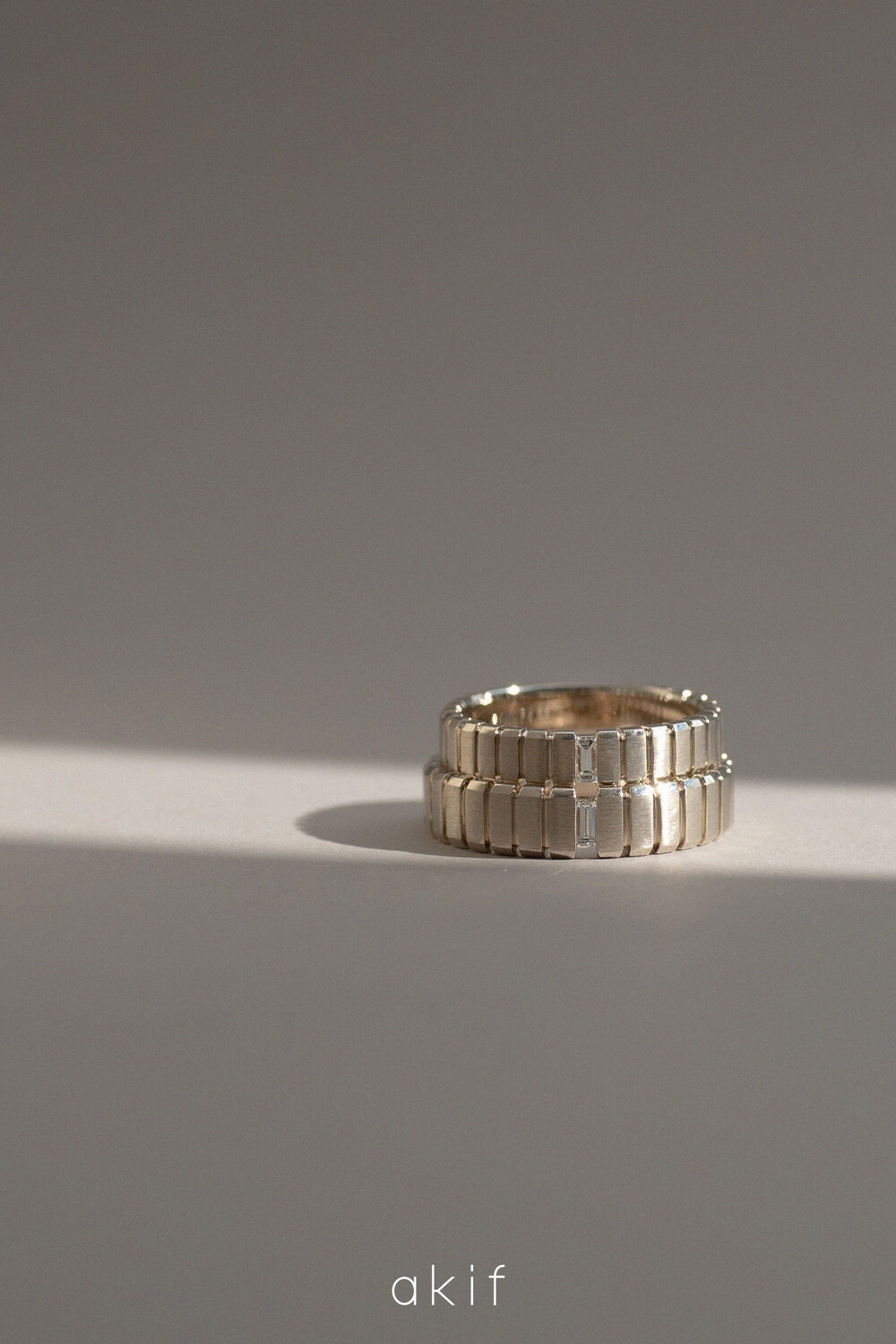 단정한 라인 위에 형성된 레이어 구조가 깊이 있는 실루엣을 완성하고, 메인부분에 세팅된 바게트 다이아몬드가 화려함보다는 구조적인 아름다움과 정제된 빛을 강조합니다.빛을 받는 각도에 따라 은은하게 반짝이며 과하지 않지만 분명한 존재감을 남기는 디자인입니다.