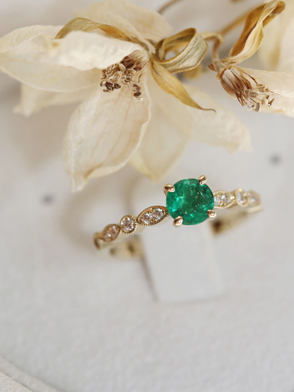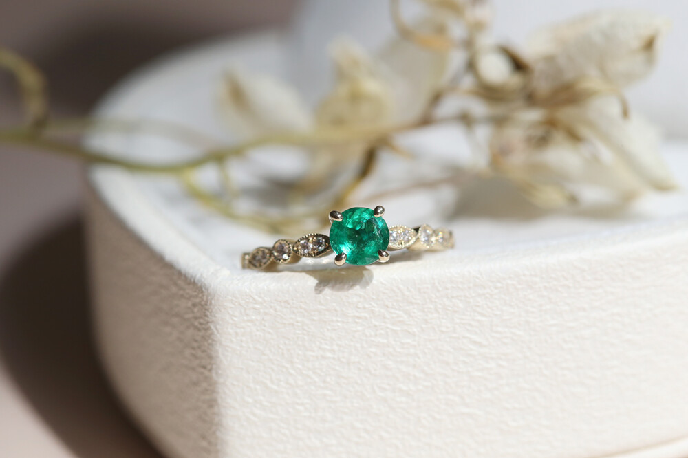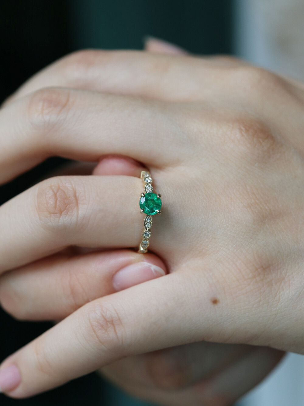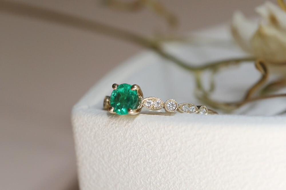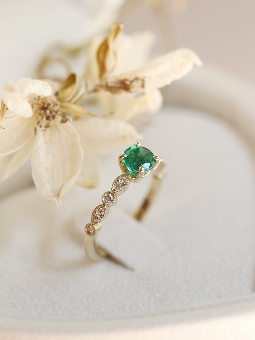 라운드 컷의 0.56 ct 콜롬비아 에메랄드가 메인으로 세팅된