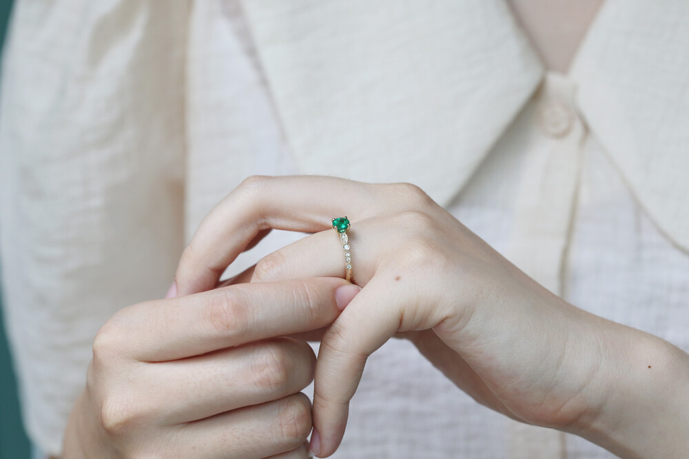 마찬가지로 이 0.56ct의 세팅된 콜롬비아 에메랄드는 내포물이 존재합니다